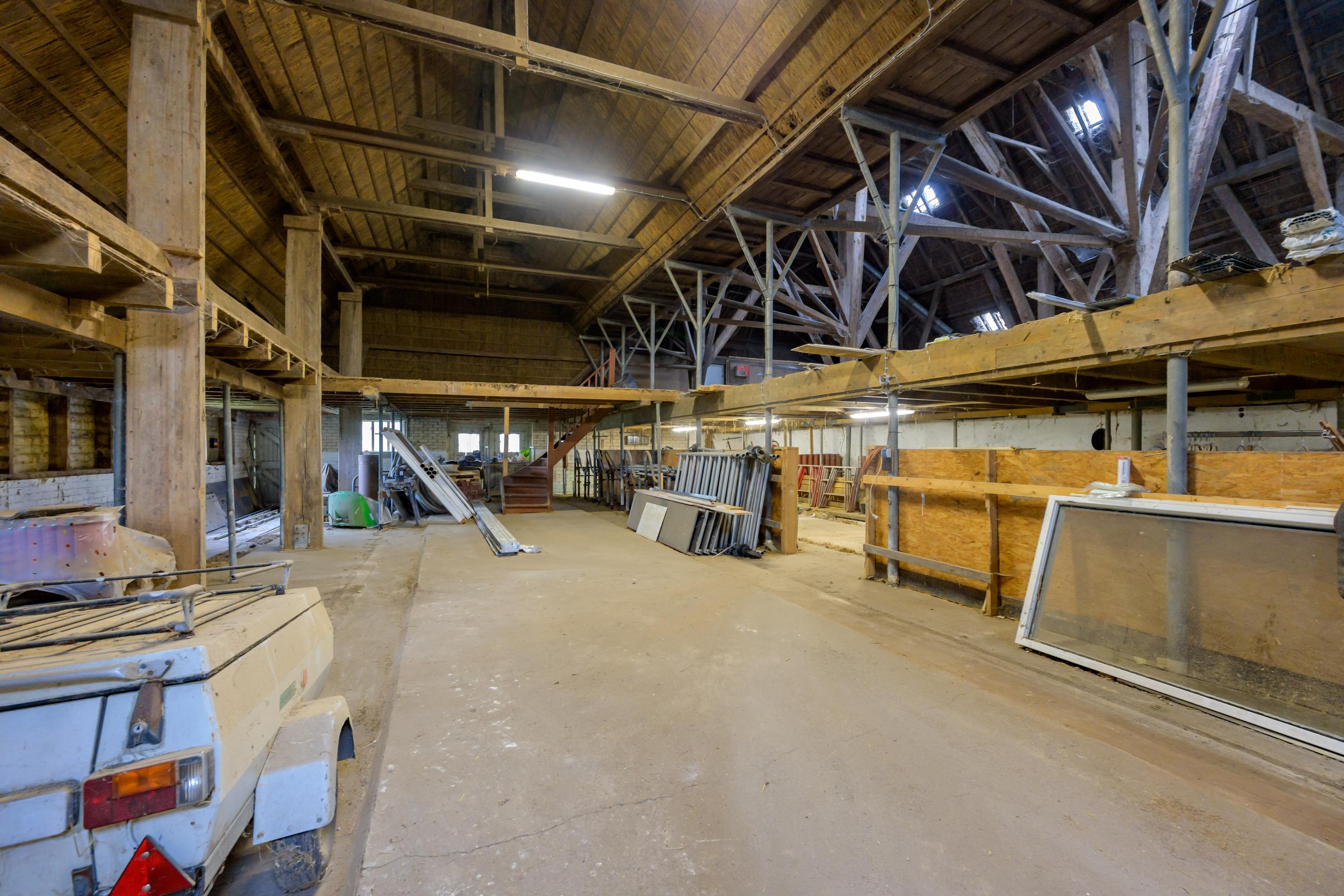 Die Scheune ist mit Pferdeboxen und Futterlager eingerichtet. Große Doppeltore bieten Zugang zum Lagerbereich.