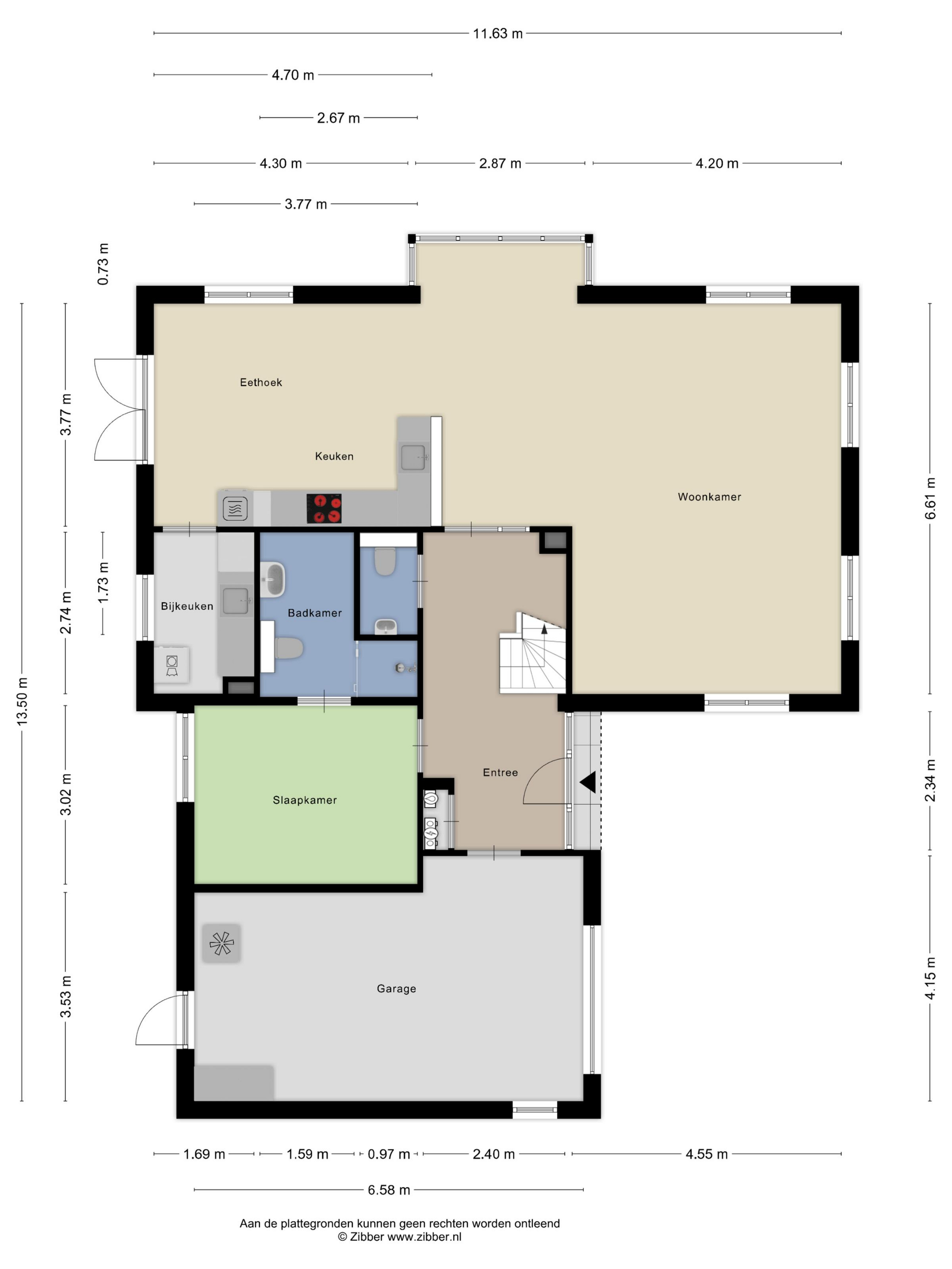 Begane grond: hal/entree, woonkamer met woonkeuken, slaapkamer met badkamer en WC, bijkeuken.